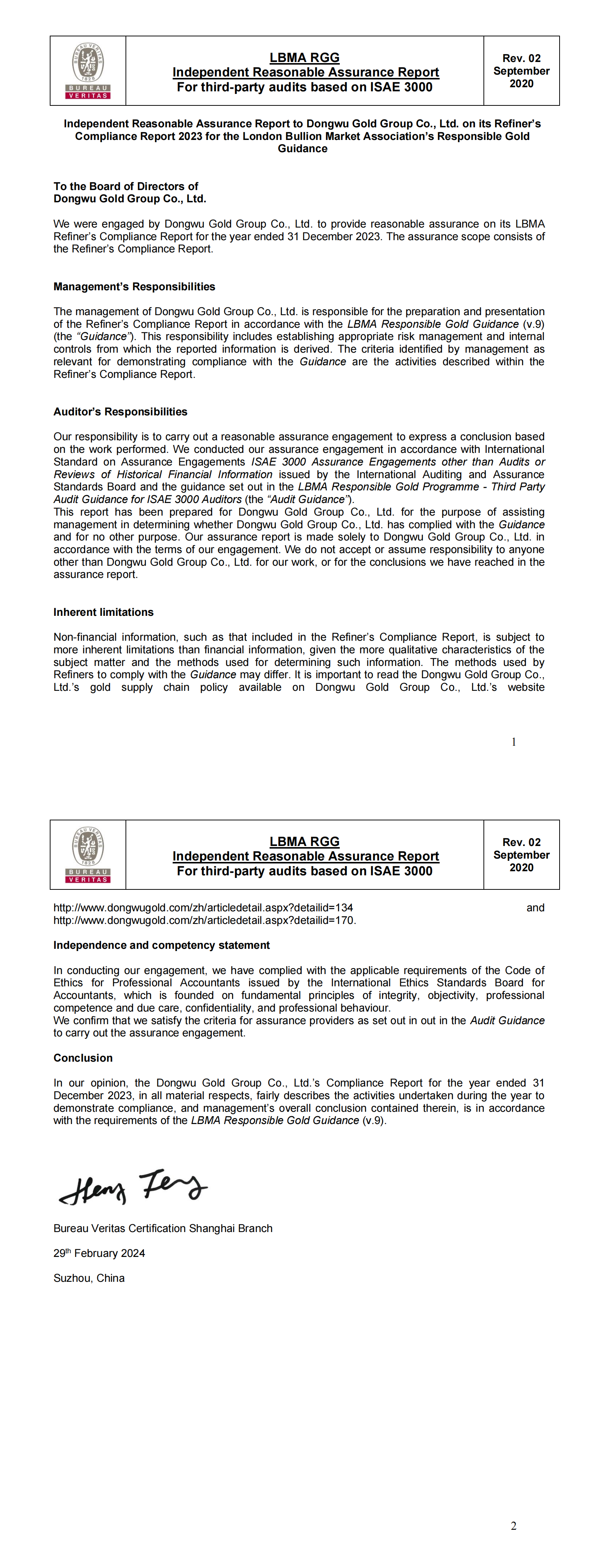 Independent Reasonable Assurance Report LBMA ISAE 3000_Gold_Dongwu Gold